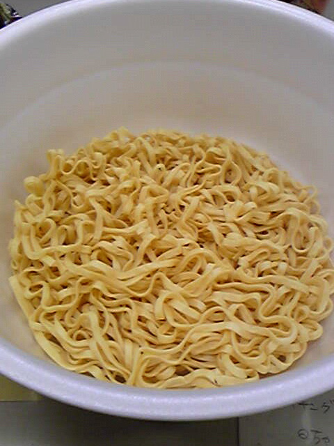 お湯を捨て、2つ目のかやくとつゆを入れ、お湯を入れます。
